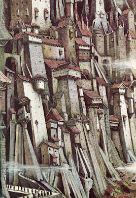 I model the four merchants as four separate rival institutions the players can choose to bolster. (Certainly the Sons and Daughters taken together as a mercenary house are also an institution.) There is also the possibility of trying to open a fifth shop, or more grandly, of trying to restore the platforms of the hanging merchants to their earlier splendor by fixing the place up and attracting visitors. (Each of these two projects was pursued by in separate campaigns by players: one group tried to build up one of the under-merchants, and the other took on the task of restoring the whole place to its former grandeur.) Furthermore there are plenty of NPCs to befriend here, as well as sources of information. Since the Over-merchant are eager to host lavish parties there is the opportunity for revelry as well, and since each under-merchant has a specialty in respectively jungle botany and animal husbandry, there are skills that can be learned as well.